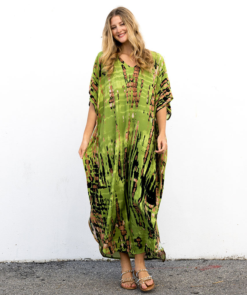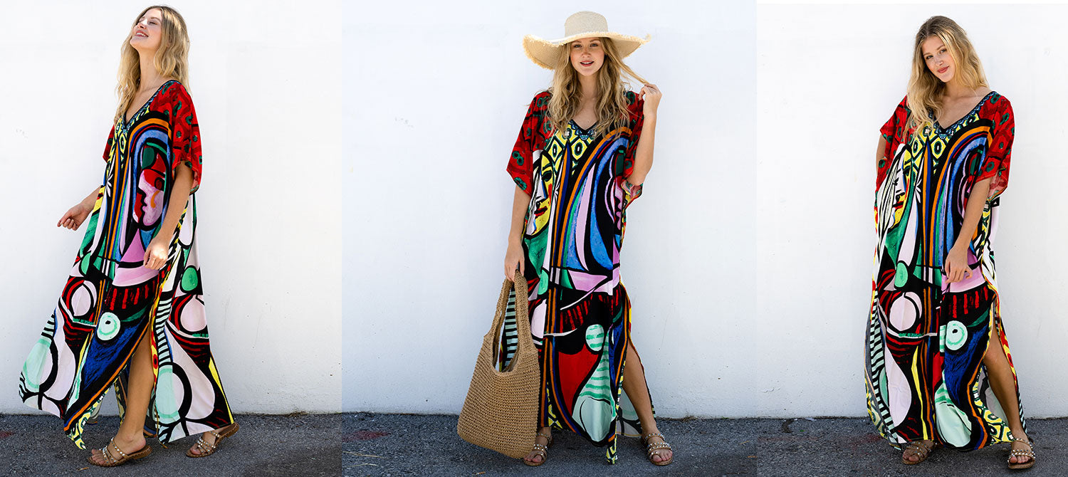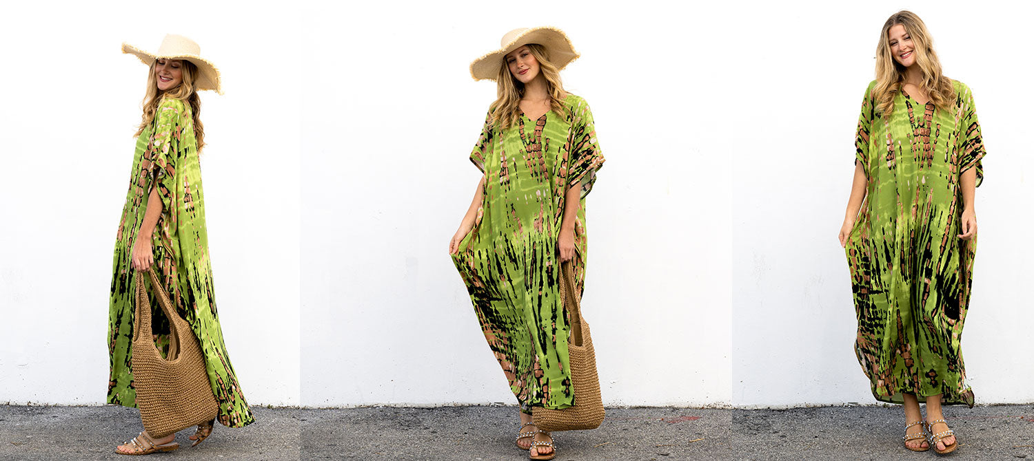 Tous les caftans ont une taille unique avec une coupe large et droite convenant à presque toutes les tailles : De 90 à 120cm pour le tour des hanches et de 150 à 190cm pour la hauteur.